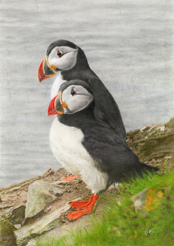 John Birnie - Atlantic Puffins. 29.7x21cm.