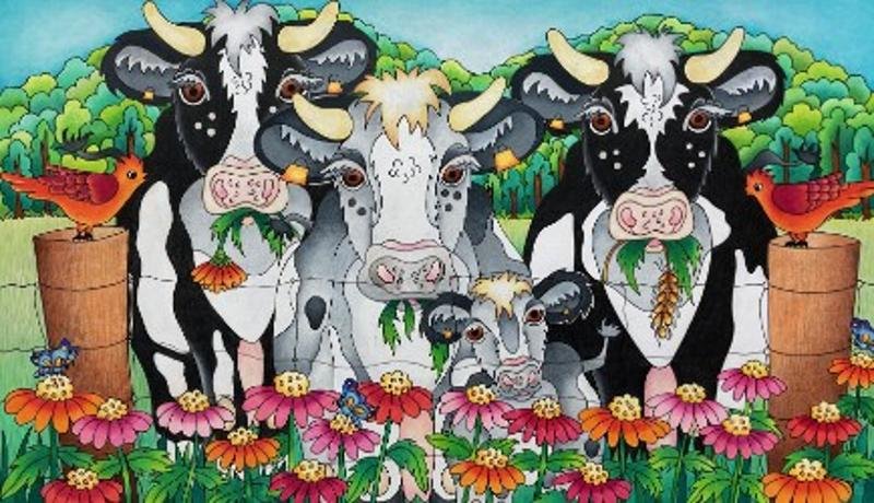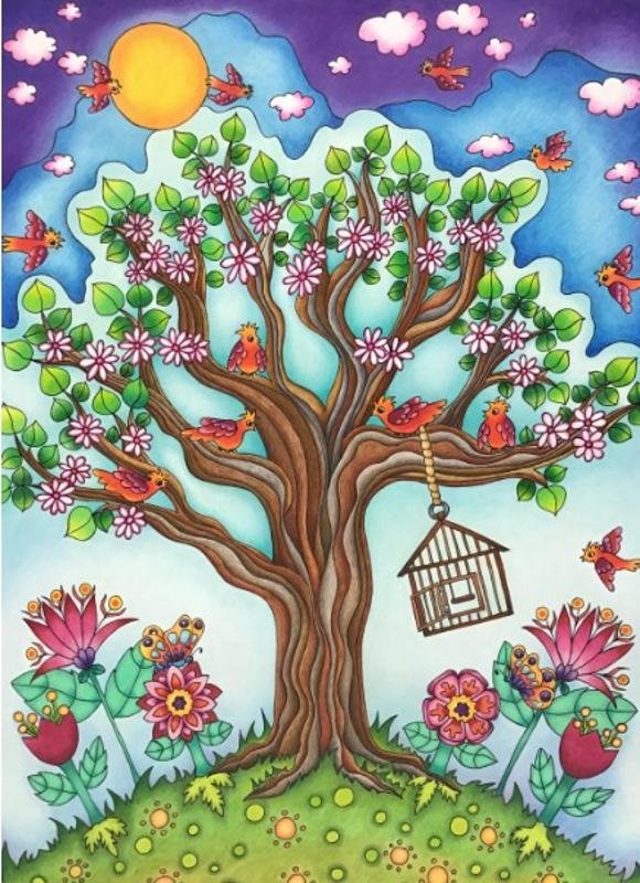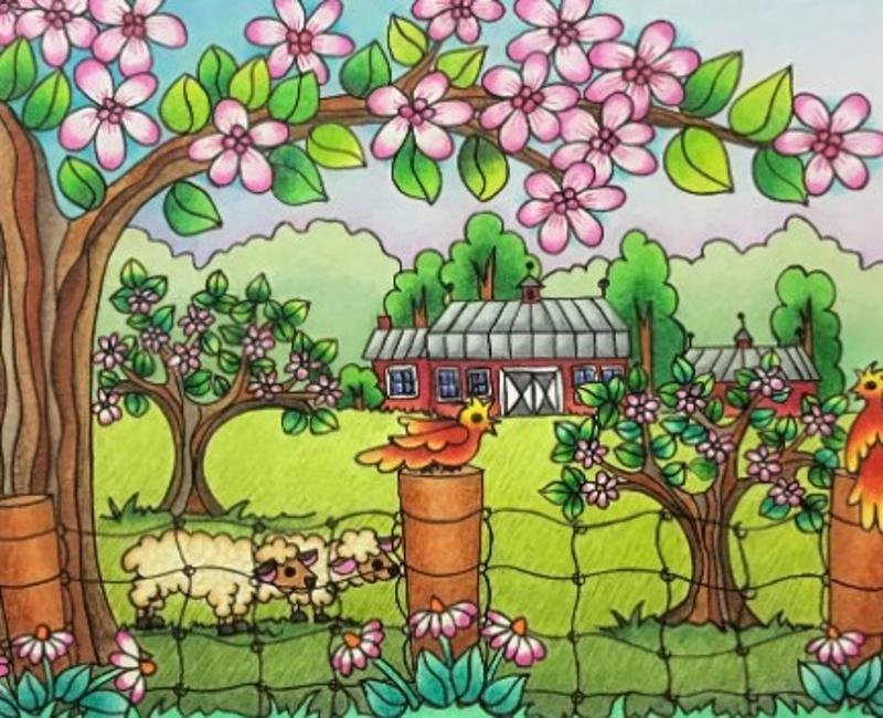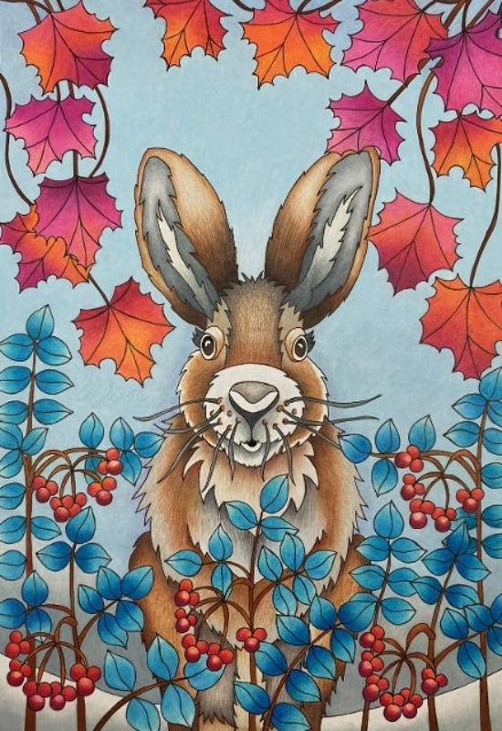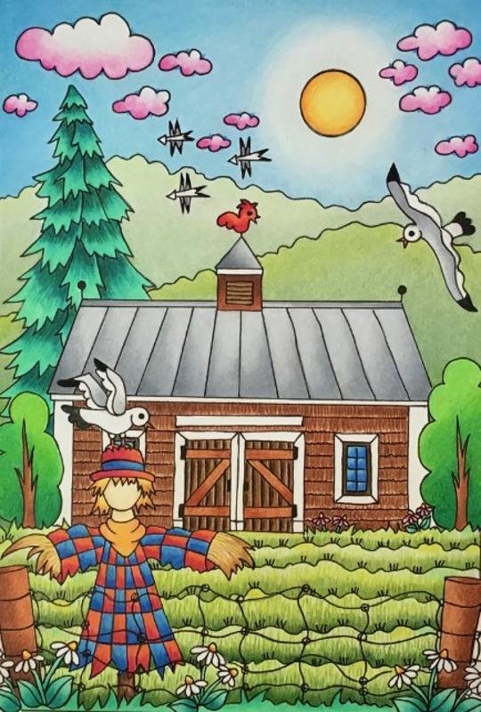 My creative process begins with a rough sketch I do in a sketchbook. Things that surround me are part on my inspiration: houses, animals, Quebec’s country side, anything in my day life. I then draw a larger piece on tracing paper putting on more details. When I am satisfied with the sketch, it is transferred on the final white paper. The white paper helps to bring out the bright pure colours I use. Outlines are made with a fine black felt pen before applying the colours. I start with a first coat of basic colours on the whole drawing adjusting and adding up the layers to obtain the effects and shading wanted. I never work on one small area at a time since I never plan my colours in advance. I adjust the colours as I go along. I use lots of blender pencil to obtain an even coat of colour and shading. As a final step, I outline all the contours again with the black felt pen. The black outlines make the colours stand out and seem brighter.