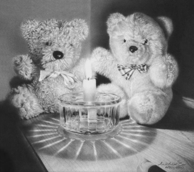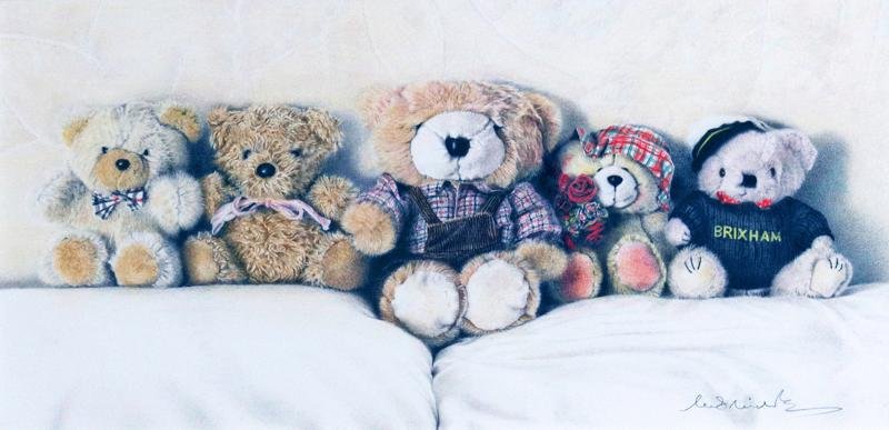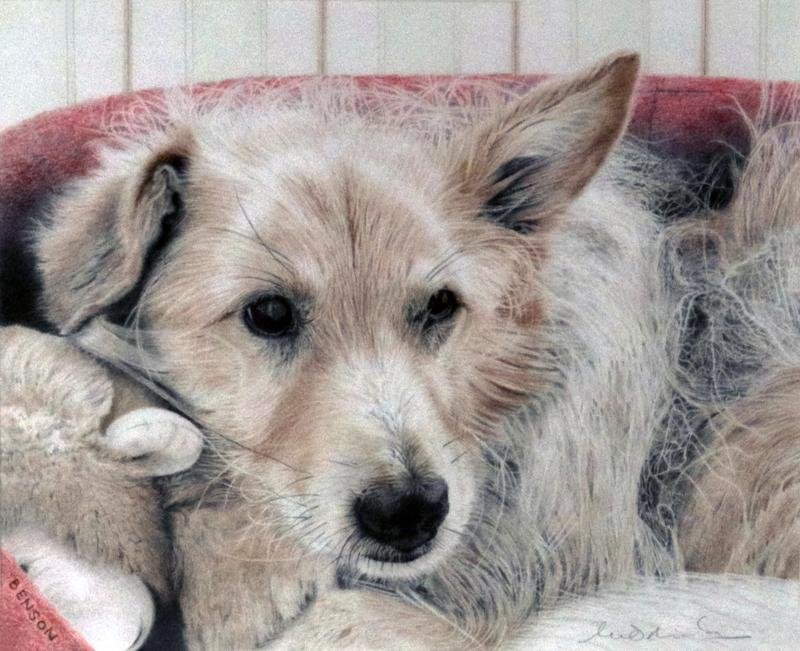 When I retired (about 12 years ago) and wishing to try something different, I purchased a full set of colour pencils from a well-known manufacturer. With a soft spot for teddies and recalling a photograph taken during an 18hr power cut in Norfolk, “Bedtime Teddies” was born. I now look back at this drawing and wonder how I managed to achieve the level of detail I did. My second colour pencil drawing was of our granddaughter’s dog called “Benson”.