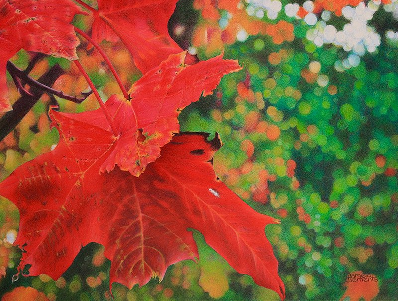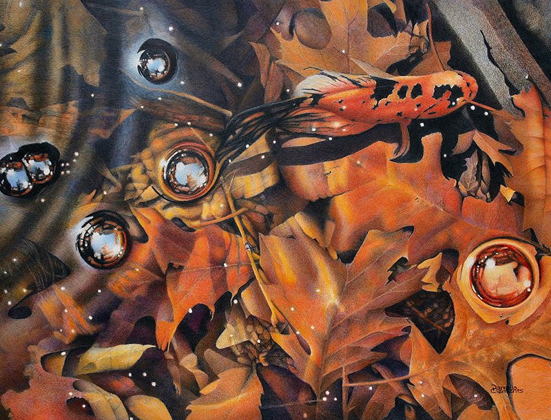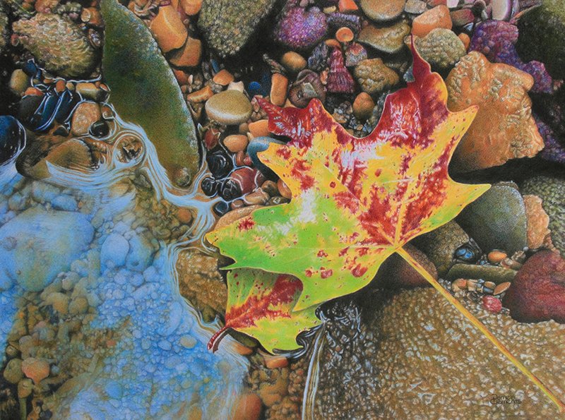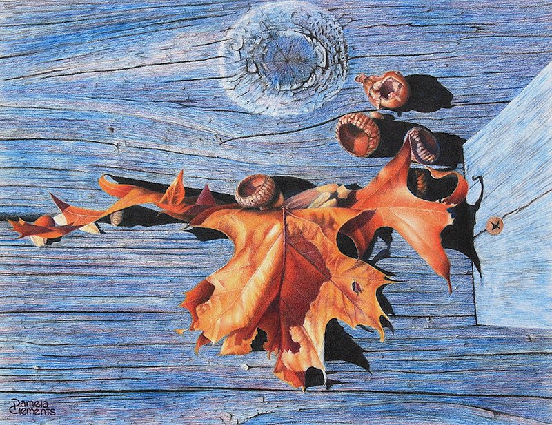 Colored pencil artist Pamela Clements grew up in Crawfordsville, a small town in west central Indiana, during a time when youth entertainment consisted of being outside, inventing daily adventures and being forced to return home only when the street lights came on. She always felt at home searching the woods for morels in the spring, fishing, rock skipping along the banks of sugar creek, and camping out in the family owned woods during summer holidays. These experiences contributed to the developing curiosity of the natural world and a further appreciation of nature’s extraordinary shapes, rich luscious earthy colors, and unique seasonal changes that contribute to Pamela’s skillfully rendered natural still life artworks in colored pencil today.