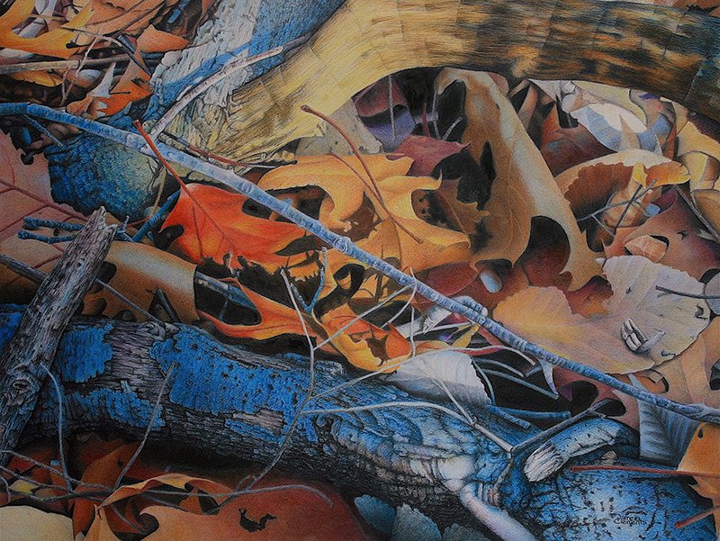 The answer comes as Pamela finds her way back to her first loves of drawing and nature, specifically the woods. As she continues to study nature, searching for the extraordinary which she labels a purple leaf, she still believes that drawing is the fundamental basis of all art. Expanding her drawing skill to include colored pencils and clarifying the vision of a purple leaf has given Pamela’s artworks a serenity of nature vision. Miles of woodland paths, continuing education of the colored pencil media, and the creative process, have all contributed to the colored pencil artworks Pamela makes today. The evolution of the media, the evolution of the artist, and the continual quest for a purple leaf will contribute to the artworks she will make tomorrow and the next day.