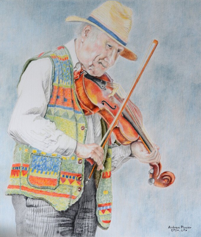 Andrea Placer - At One With His Fiddle. 35.56 x 30.48cm.