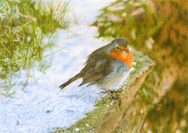 John Birnie - Robin Redbreast in Snow. 21x29.7cm.